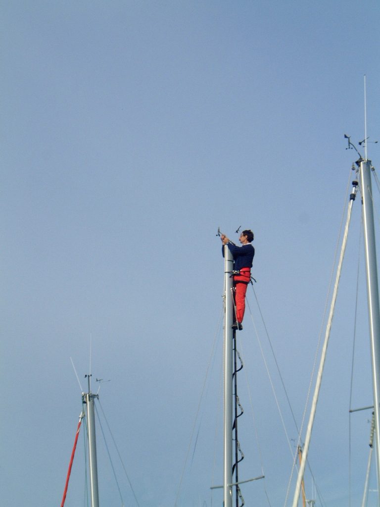 replacing navigation lights, servicing spreaders, installing a wind vane — all while staying safe thanks to the additional equipment, including a work harness and fall arrest system.